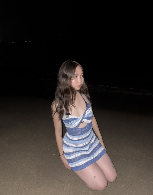 ストライプ柄のかぎ針編みミニドレス
