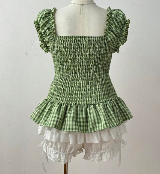 ギンガムチェックのコルセット風パフスリーブ&ペプラム裾ブラウス
