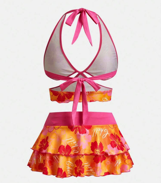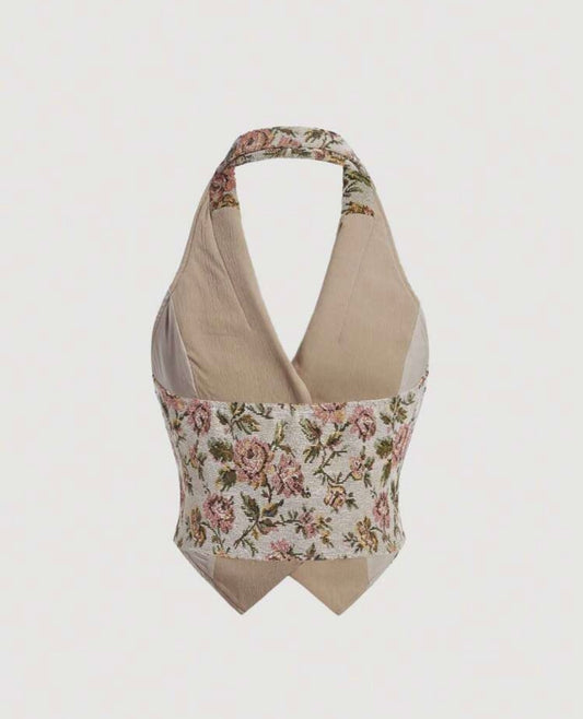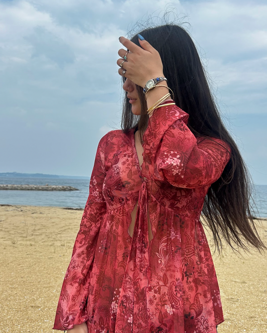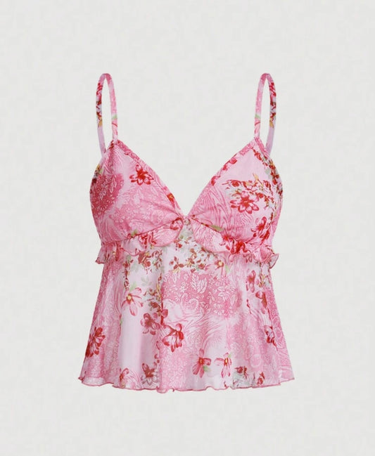 Asymmetrical Mesh Top with Pink Lily Print and Flared Sleeves