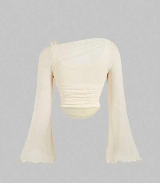Sheer Mesh Blouse With Bell Sleeves And Floral Print