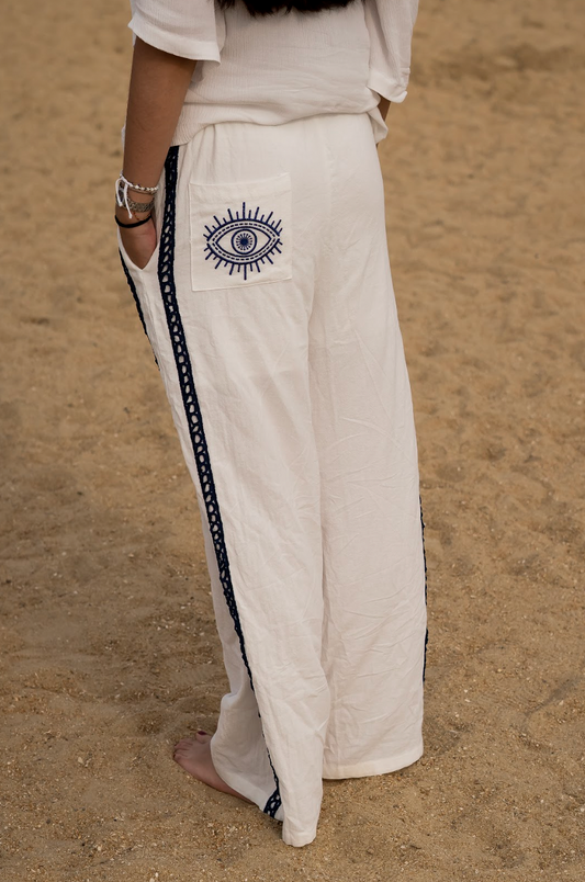 White Wide-Leg Pants With Eye Embroidery And Side Stripes